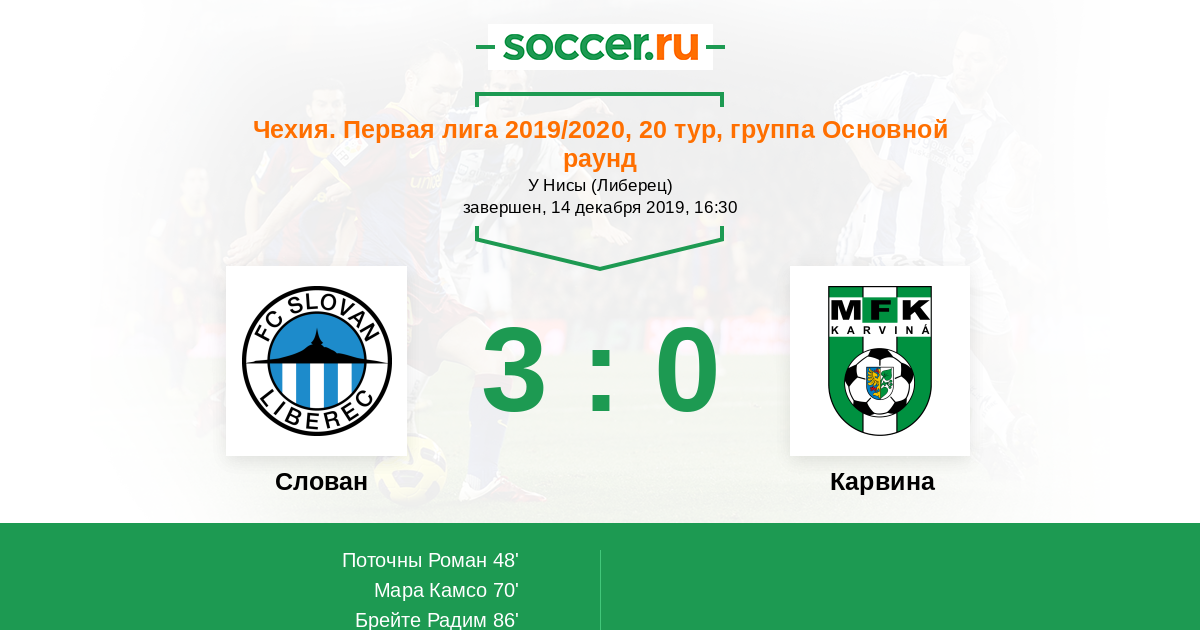 Чехия. Первая Лига 20.09.2020 Слован Логотип футбольный клуб Слован (Либерец) 1:1 Логотип футбольный клуб Карвина Карвина