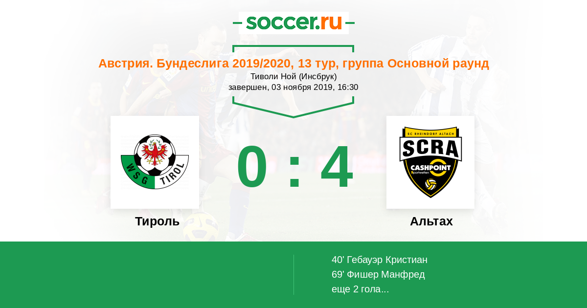 Австрия. Бундеслига 26.09.2020 Альтах Логотип футбольный клуб Альтах 0:2 Логотип футбольный клуб Тироль (Ваттенс) Тироль