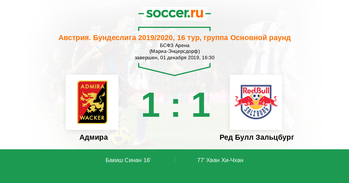 Австрия. Бундеслига 11.03.2017 Адмира Логотип футбольный клуб Адмира (Мёдлинг) 1:1 Логотип футбольный клуб Ред Булл Зальцбург Ред Булл Зальцбург