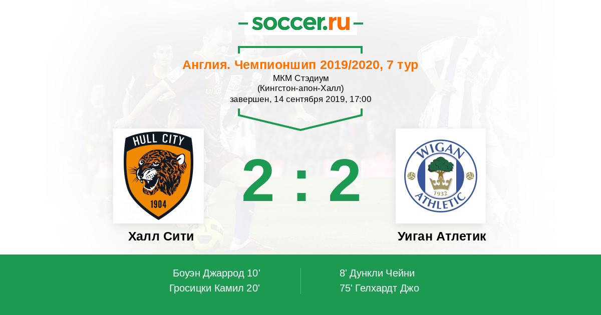 Англия. Чемпионшип 18.09.2018 Уиган Атлетик Логотип футбольный клуб Уиган Атлетик 2:1 Логотип футбольный клуб Халл Сити (Кингстон-апон-Халл) Халл Сити