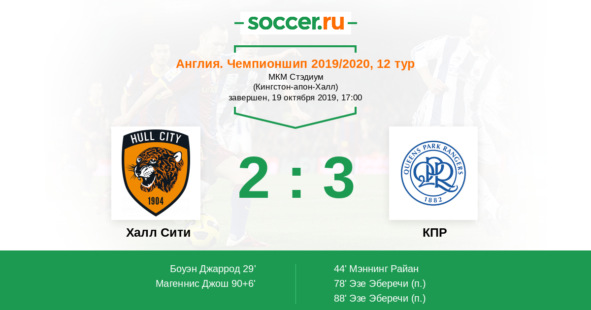 Англия. Чемпионшип 29.12.2019 КПР Логотип футбольный клуб КПР (Лондон) 1:2 Логотип футбольный клуб Халл Сити (Кингстон-апон-Халл) Халл Сити