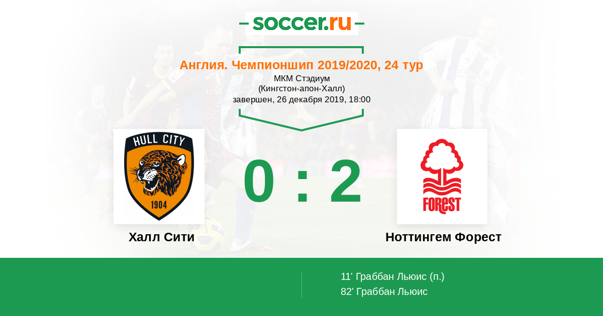 Англия. Чемпионшип 24.11.2018 Халл Сити Логотип футбольный клуб Халл Сити (Кингстон-апон-Халл) 0:2 Логотип футбольный клуб Ноттингем Форест Ноттингем Форест