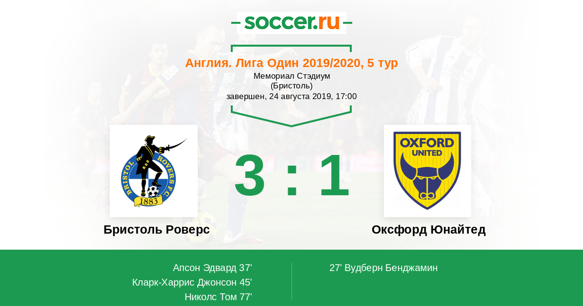 Англия. Первая Футбольная Лига 14.08.2016 Бристоль Роверс Логотип футбольный клуб Бристоль Роверс 2:1 Логотип футбольный клуб Оксфорд Юнайтед Оксфорд Юнайтед