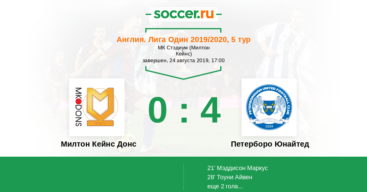 Англия. Первая Футбольная Лига 16.08.2014 Петерборо Юнайтед Логотип футбольный клуб Петерборо Юнайтед 3:2 Логотип футбольный клуб Милтон Кейнс Донс Милтон Кейнс Донс