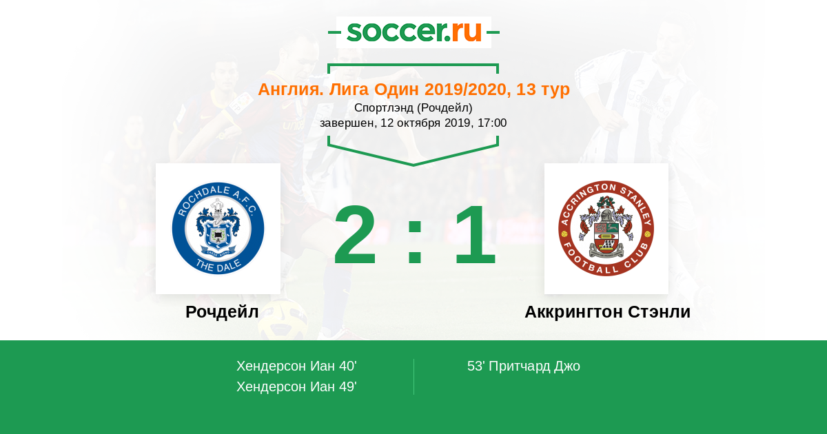Англия. Первая Футбольная Лига 01.01.2020 Аккрингтон Стэнли Логотип футбольный клуб Аккрингтон Стэнли 1:2 Логотип футбольный клуб Рочдейл Рочдейл