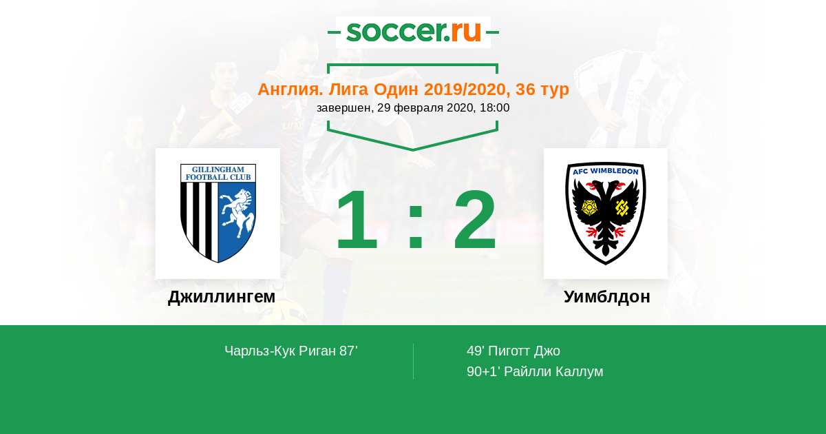 Англия. Первая Футбольная Лига 23.03.2019 Уимблдон Логотип футбольный клуб Уимблдон (Лондон) 2:4 Логотип футбольный клуб Джиллингем Джиллингем