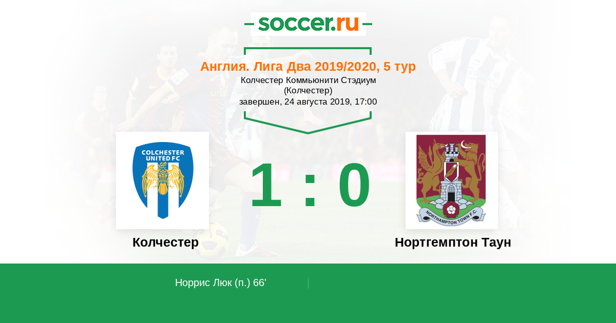 Англия. Вторая Футбольная Лига 25.08.2018 Колчестер Логотип футбольный клуб Колчестер 1:2 Логотип футбольный клуб Нортгемптон Таун Нортгемптон Таун