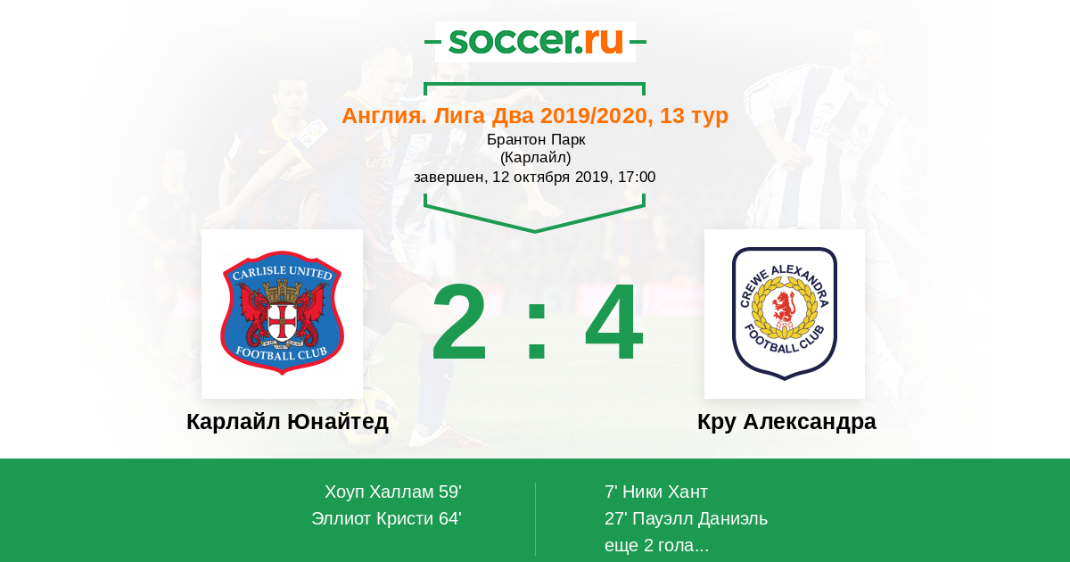 Англия. Вторая Футбольная Лига 01.01.2020 Кру Александра Логотип футбольный клуб Кру Александра 4:1 Логотип футбольный клуб Карлайл Юнайтед (Карлайсл) Карлайл Юнайтед