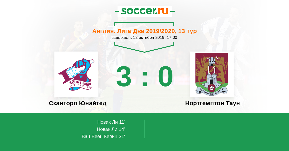 Англия. Первая Футбольная Лига 18.11.2017 Нортгемптон Таун Логотип футбольный клуб Нортгемптон Таун 0:3 Логотип футбольный клуб Сканторп Юнайтед Сканторп Юнайтед