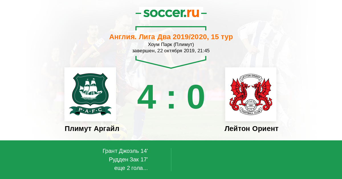 Англия. Кубок Лиги 13.08.2019 Плимут Аргайл Логотип футбольный клуб Плимут Аргайл 2:0 Логотип футбольный клуб Лейтон Ориент Лейтон Ориент
