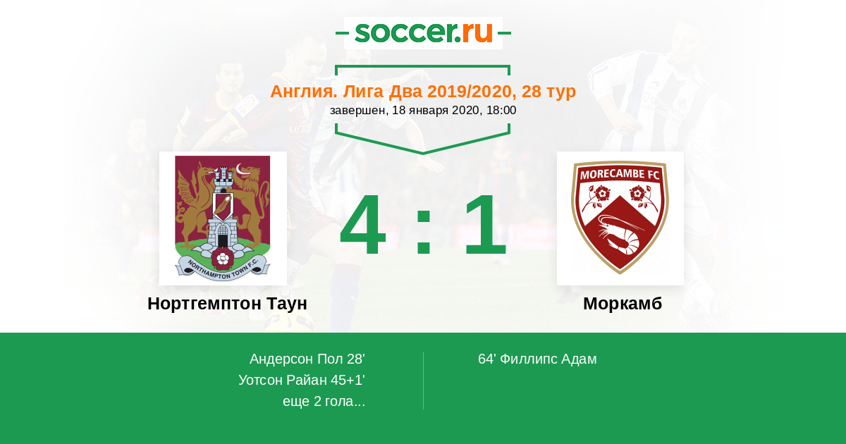 Англия. Вторая Футбольная Лига 21.08.2018 Моркамб Логотип футбольный клуб Моркамб 1:0 Логотип футбольный клуб Нортгемптон Таун Нортгемптон Таун