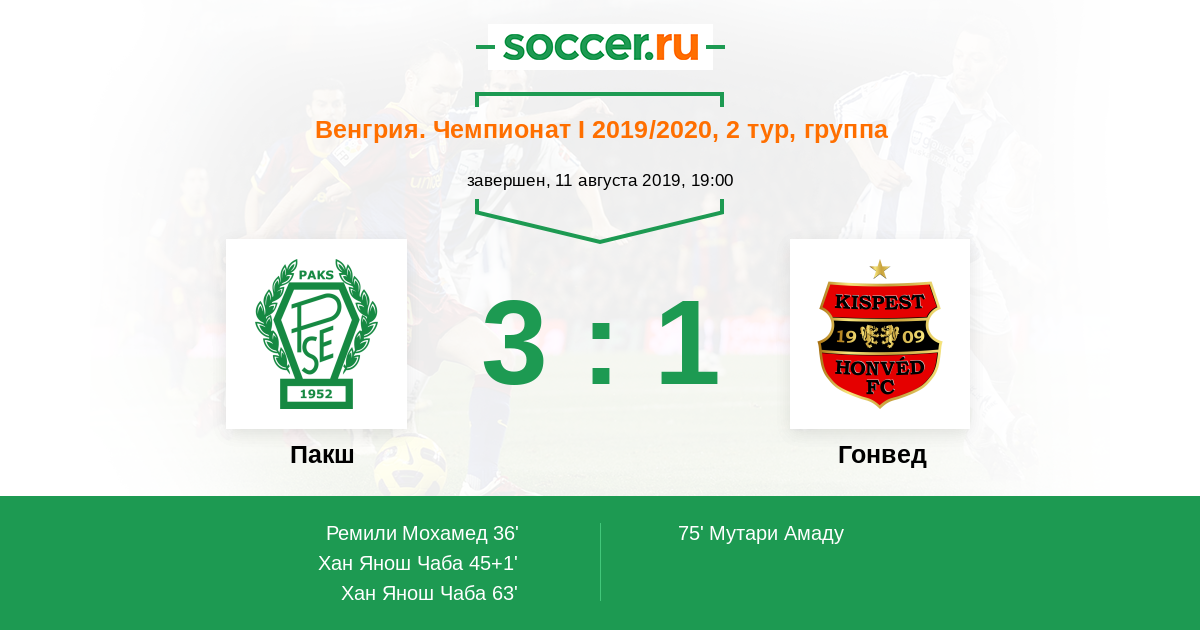 Венгрия. Чемпионат 1 05.08.2018 Гонвед Логотип футбольный клуб Гонвед (Будапешт) 1:0 Логотип футбольный клуб Пакш Пакш