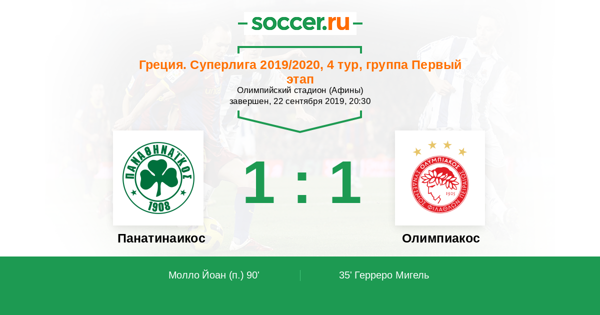 Греция. Суперлига 05.01.2020 Олимпиакос Логотип футбольный клуб Олимпиакос (Пирей) 1:0 Логотип футбольный клуб Панатинаикос (Афины) Панатинаикос