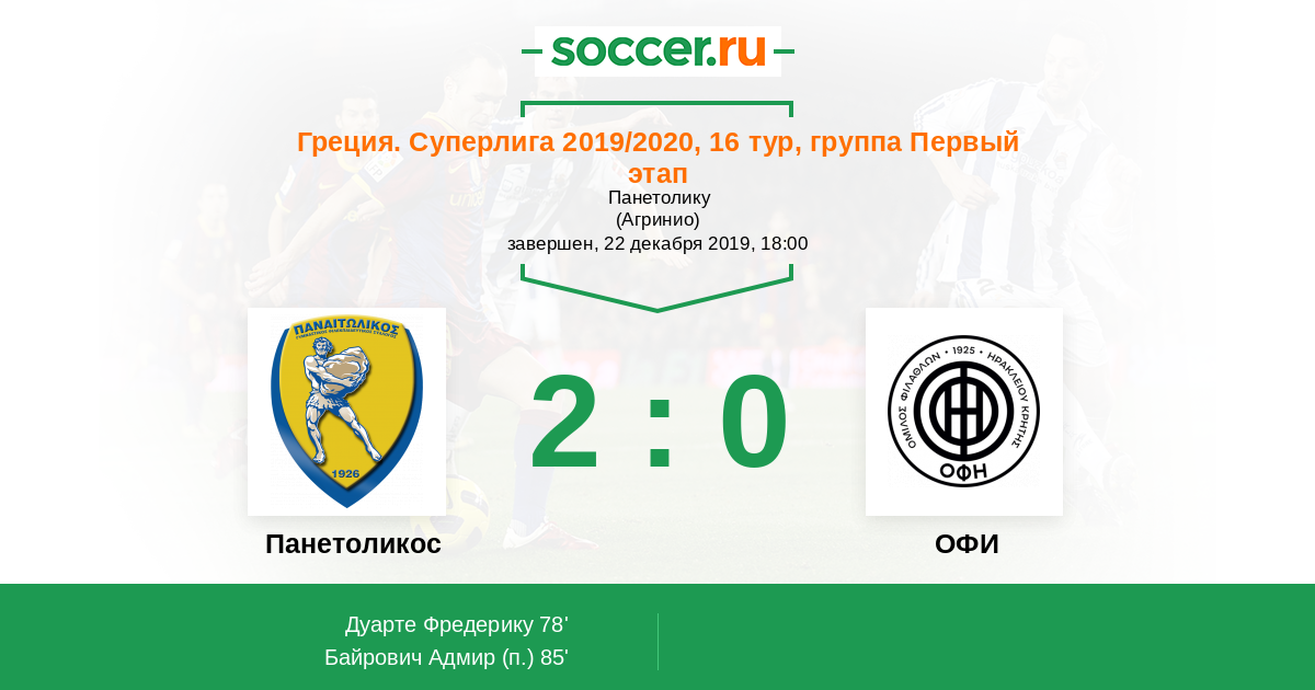 Греция. Суперлига 20.01.2019 ОФИ Логотип футбольный клуб ОФИ (Ираклион) 3:0 Логотип футбольный клуб Панетоликос (Агринио) Панетоликос