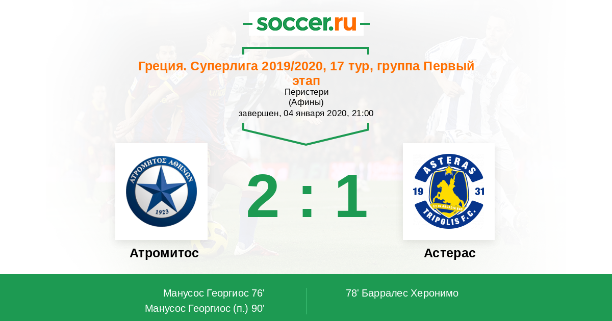 Греция. Суперлига 14.10.2017 Атромитос Логотип футбольный клуб Атромитос (Перистери) 1:0 Логотип футбольный клуб Астерас (Триполис) Астерас