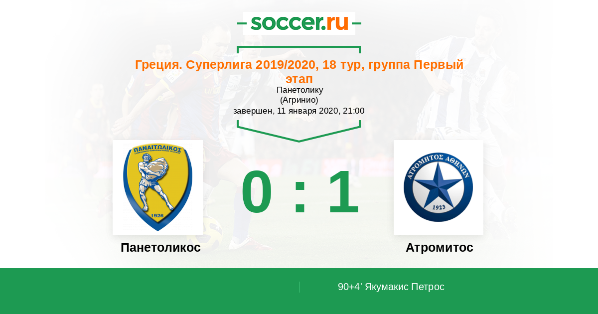 Греция. Суперлига 14.01.2018 Атромитос Логотип футбольный клуб Атромитос (Перистери) 0:1 Логотип футбольный клуб Панетоликос (Агринио) Панетоликос