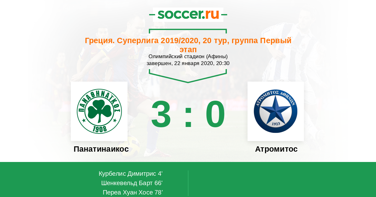 Греция. Суперлига 22.01.2012 Панатинаикос Логотип футбольный клуб Панатинаикос (Афины) 1:0 Логотип футбольный клуб Атромитос (Перистери) Атромитос