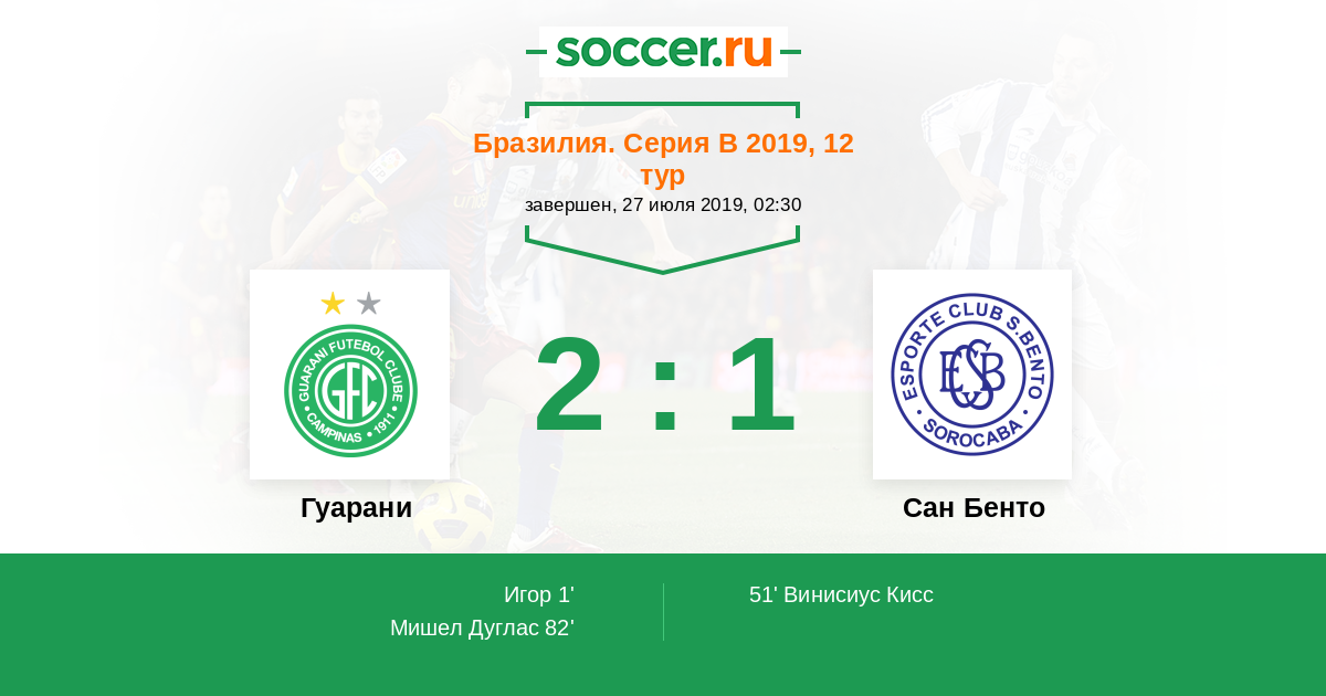 Бразилия. Серия В 26.10.2019 Сан Бенто Логотип футбольный клуб Сан Бенто 1:1 Логотип футбольный клуб Гуарани (Кампинас) Гуарани