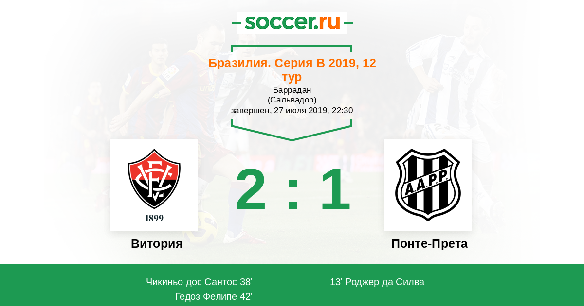 Бразилия. Серия В 27.10.2019 Понте-Прета Логотип футбольный клуб Понте-Прета (Кампинас) 1:2 Логотип футбольный клуб Витория (Сальвадор) Витория