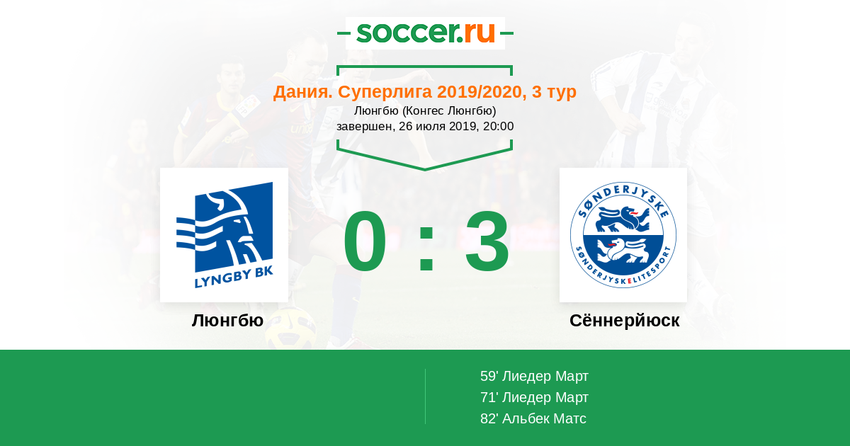 Дания. Суперлига 08.07.2020 Люнгбю Логотип футбольный клуб Люнгбю (Конгес Люнгбю) 1:1 Логотип футбольный клуб Сённерйюск (Хадерслев) Сённерйюск