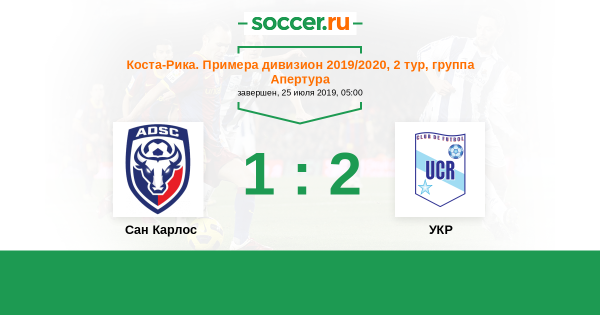 Коста-Рика. Примера дивизион 19.09.2019 УКР Логотип футбольный клуб УКР (Сан Хосе) 1:1 Логотип футбольный клуб Сан Карлос (Сьюдад Куэсада) Сан Карлос