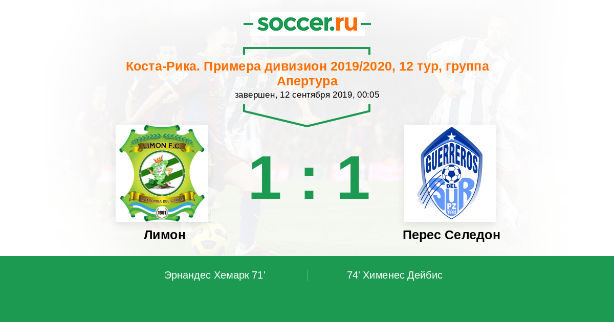 Коста-Рика. Примера дивизион 16.09.2012 Зеледон Логотип футбольный клуб Зеледон (Сан Исидро де Эль Хенерал) 4:3 Логотип футбольный клуб Лимон Лимон