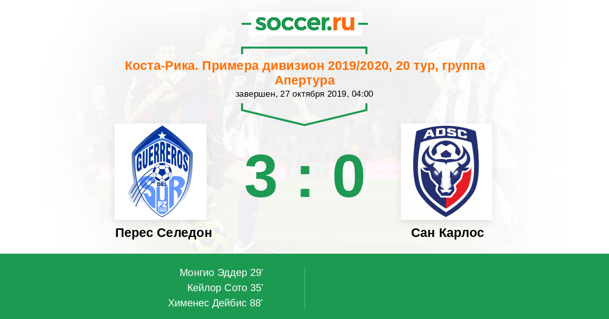 Коста-Рика. Примера дивизион 04.08.2011 Зеледон Логотип футбольный клуб Зеледон (Сан Исидро де Эль Хенерал) 1:0 Логотип футбольный клуб Сан Карлос (Сьюдад Куэсада) Сан Карлос