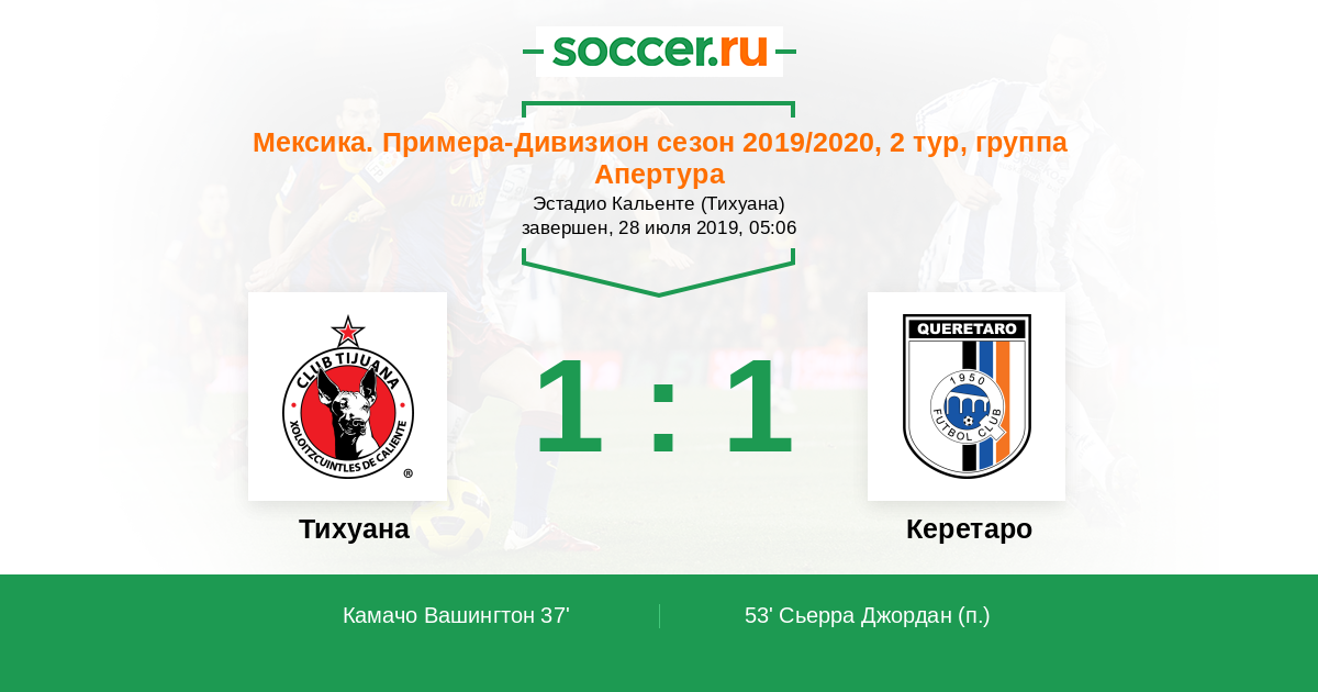 Мексика. Примера-Дивизион 07.10.2018 Тихуана Логотип футбольный клуб Тихуана 1:1 Логотип футбольный клуб Керетаро (Сантьяго-де-Керетаро) Керетаро