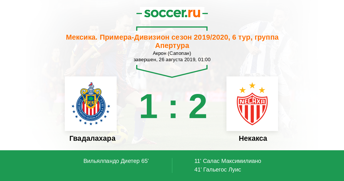 Мексика. Примера-Дивизион 12.09.2020 Некакса Логотип футбольный клуб Некакса (Агуаскальентес) 1:2 Логотип футбольный клуб Гвадалахара Гвадалахара