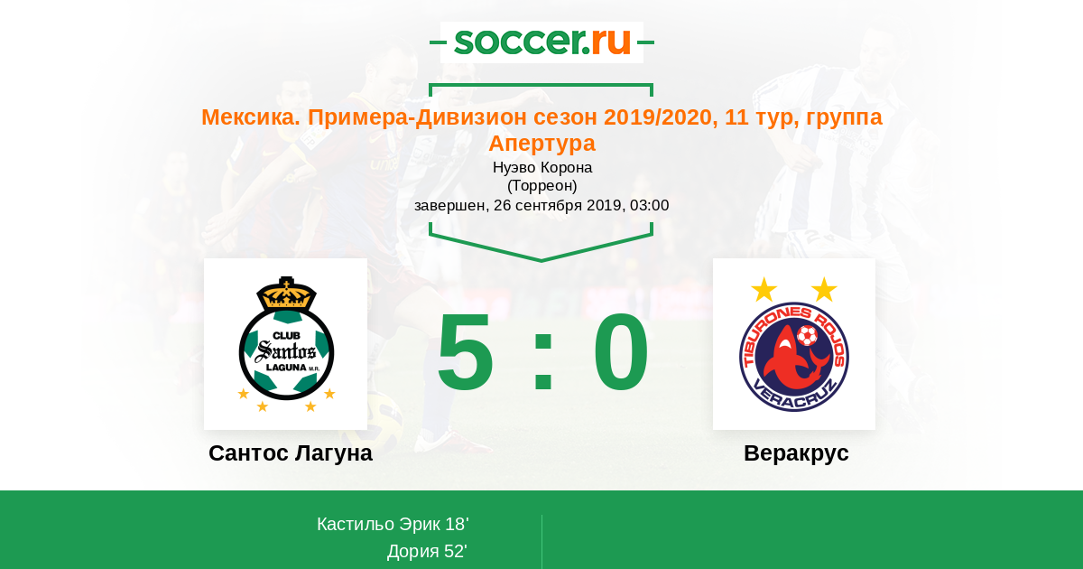 Мексика. Примера-Дивизион 09.03.2019 Веракрус Логотип футбольный клуб Веракрус 2:2 Логотип футбольный клуб Сантос Лагуна (Торреон) Сантос Лагуна