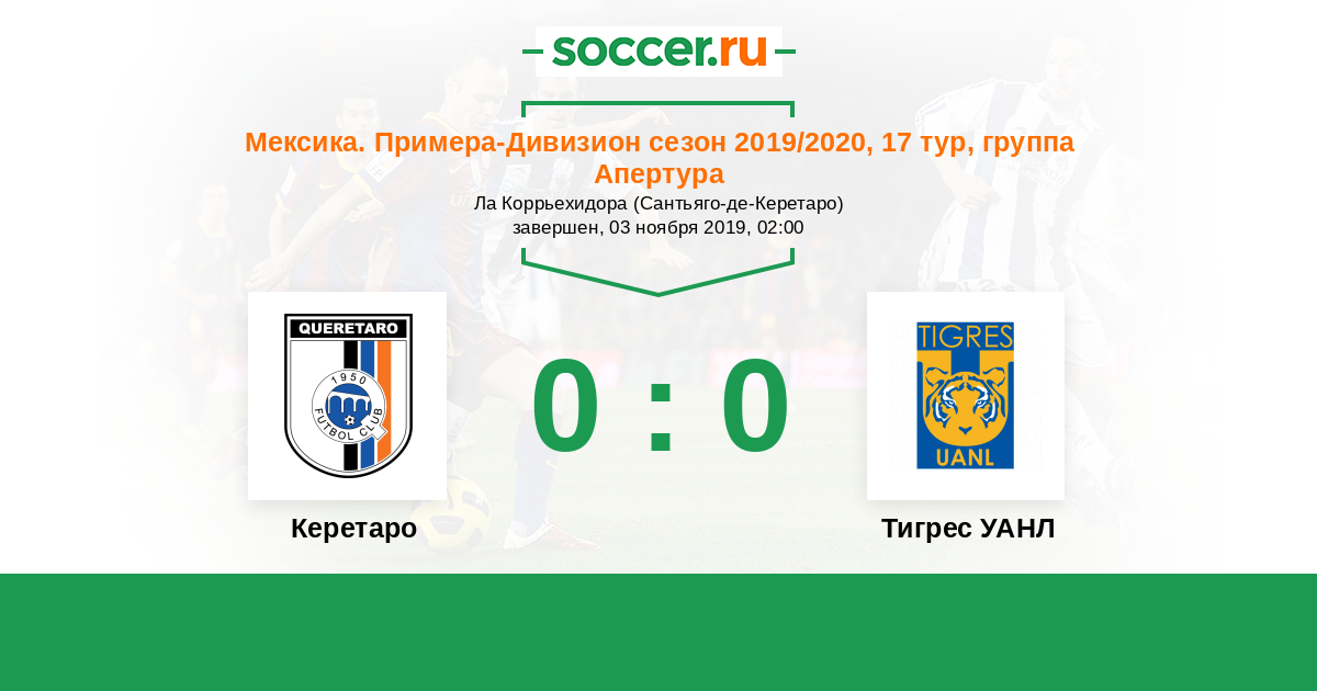 Мексика. Примера-Дивизион 21.01.2018 Керетаро Логотип футбольный клуб Керетаро (Сантьяго-де-Керетаро) 0:0 Логотип футбольный клуб Тигрес УАНЛ (Монтеррей) Тигрес УАНЛ