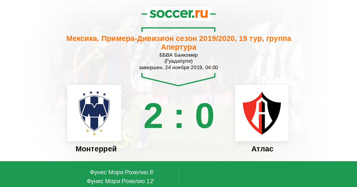 Мексика. Примера-Дивизион 06.05.2019 Атлас Логотип футбольный клуб Атлас (Гвадалахара) 2:0 Логотип футбольный клуб Монтеррей Монтеррей