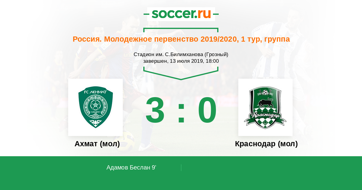 Россия. Премьер-Лига U21 23.04.2019 Ахмат (мол) Логотип футбольный клуб Ахмат (мол) (Грозный) 1:2 Логотип футбольный клуб Краснодар (мол) Краснодар (мол)