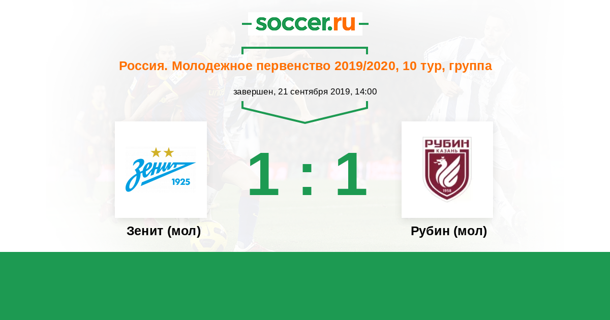 Россия. Премьер-Лига U21 29.09.2020 Рубин (мол) Логотип футбольный клуб Рубин (мол) (Казань) 1:2 Логотип футбольный клуб Зенит (мол) (Санкт-Петербург) Зенит (мол)