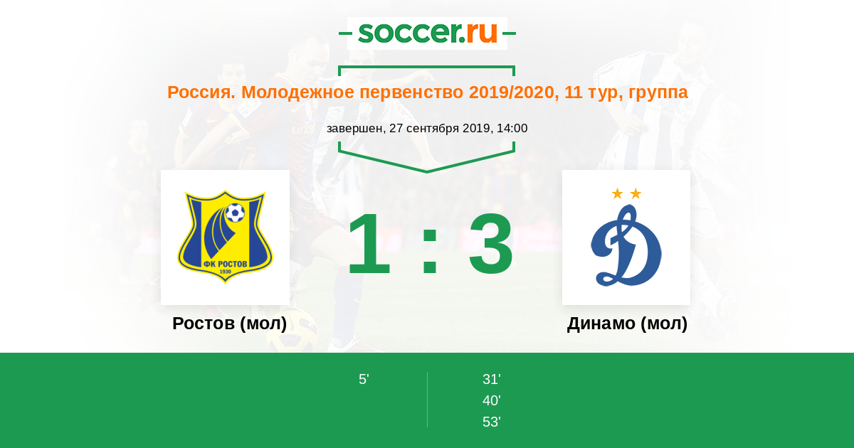 Россия. Премьер-Лига U21 31.08.2013 Динамо (мол) Логотип футбольный клуб Динамо (мол) (Москва) 4:1 Логотип футбольный клуб Ростов (мол) (Ростов-на-Дону) Ростов (мол)