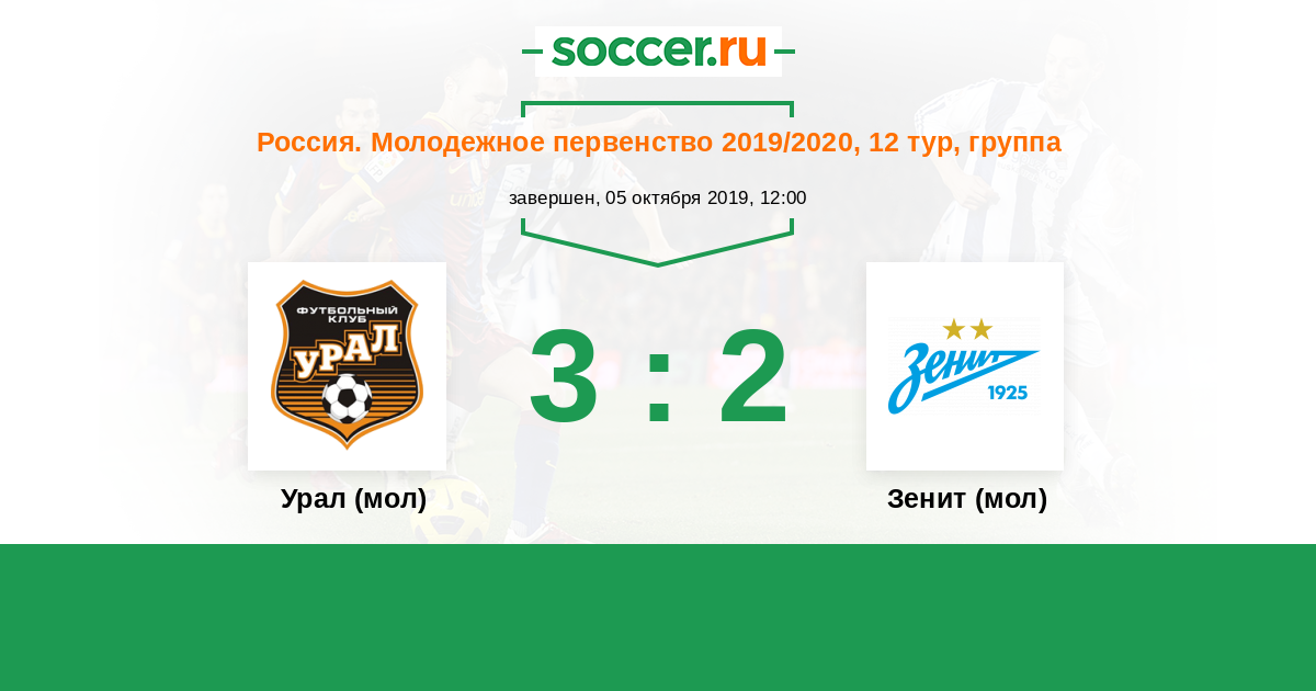 Россия. Премьер-Лига U21 01.03.2019 Урал (мол) Логотип футбольный клуб Урал (мол) (Екатеринбург) 0:3 Логотип футбольный клуб Зенит (мол) (Санкт-Петербург) Зенит (мол)