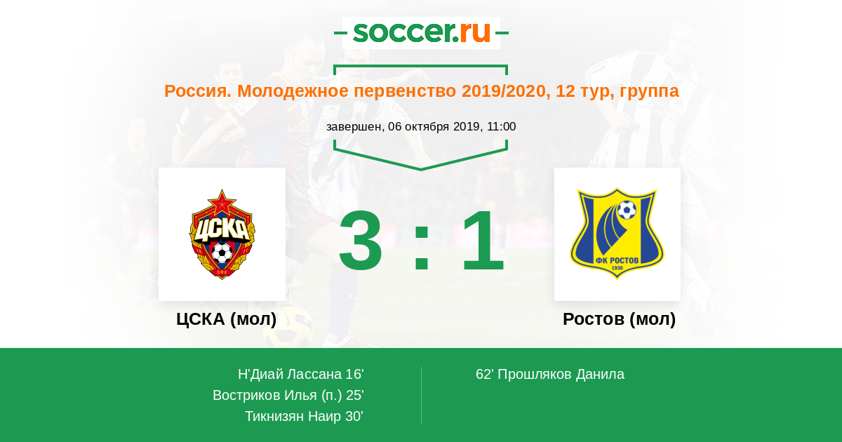 Россия. Премьер-Лига U21 02.10.2016 Ростов (мол) Логотип футбольный клуб Ростов (мол) (Ростов-на-Дону) 2:0 Логотип футбольный клуб ЦСКА (мол) (Москва) ЦСКА (мол)