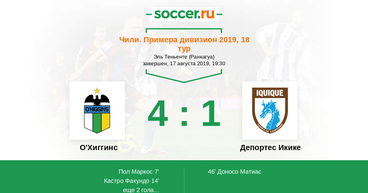 Чили. Примера дивизион 18.10.2025 Депортес Икике Логотип футбольный клуб Депортес Икике 2:3 Логотип футбольный клуб О'Хиггинс (Ранкагуа) О'Хиггинс