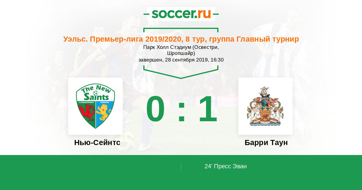 Уэльс. Премьер-Лига 12.09.2020 Барри Таун Логотип футбольный клуб Барри Таун 0:3 Логотип футбольный клуб Нью-Сейнтс (Ллансантффрайд) Нью-Сейнтс