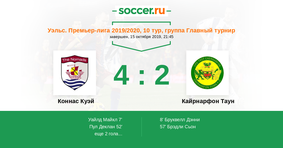Уэльс. Премьер-Лига 05.04.2019 Кайрнарфон Таун Логотип футбольный клуб Кайрнарфон Таун 1:0 Логотип футбольный клуб Коннас Куэй Коннас Куэй