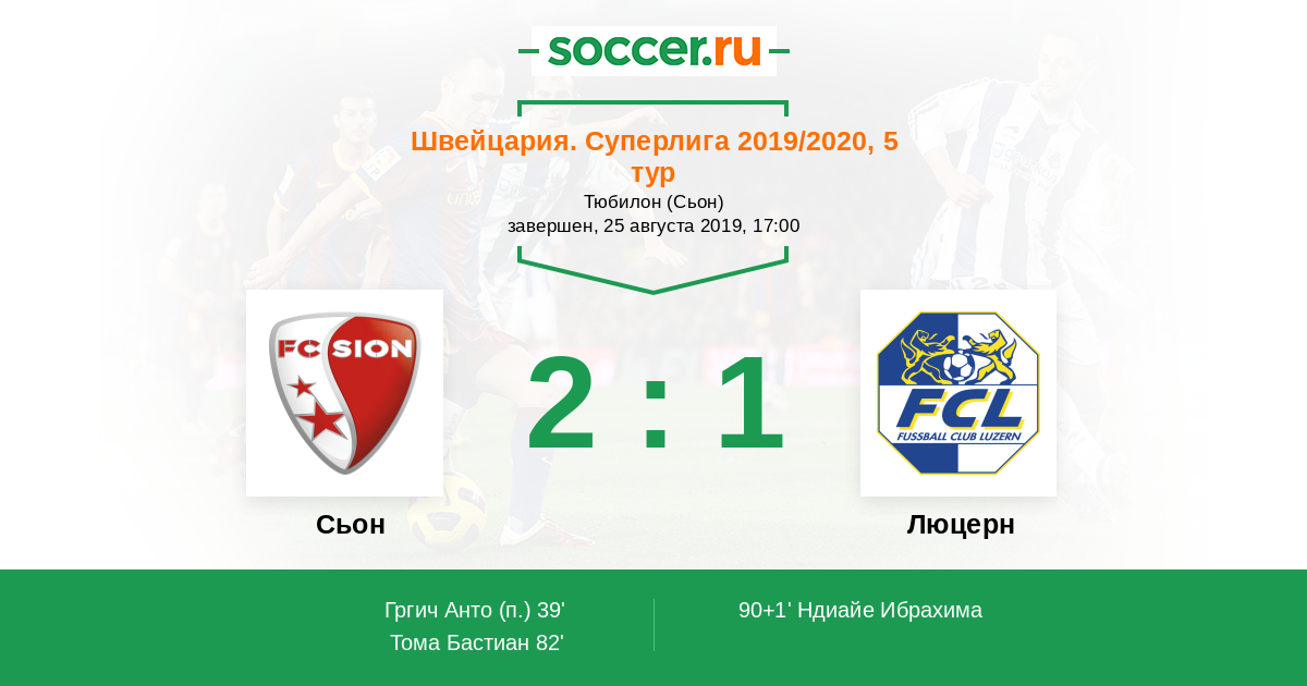 Швейцария. Суперлига 20.10.2019 Люцерн Логотип футбольный клуб Люцерн 3:1 Логотип футбольный клуб Сьон Сьон