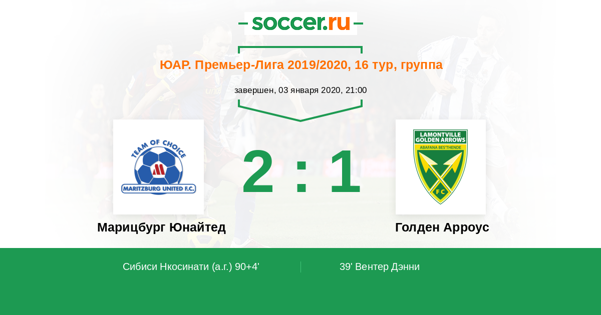 ЮАР. Премьер-Лига 30.01.2021 Голден Арроус Логотип футбольный клуб Голден Арроус (Дурбан) 2:1 Логотип футбольный клуб Марицбург Юнайтед (Питермарицбург) Марицбург Юнайтед