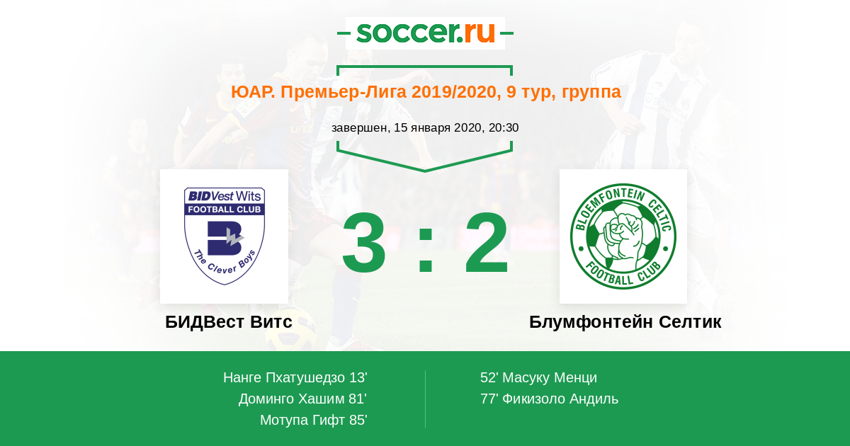 ЮАР. Премьер-Лига 15.03.2019 Блумфонтейн Селтик Логотип футбольный клуб Блумфонтейн Селтик 2:4 Логотип футбольный клуб БИДВест Витс (Йоханнесбург) БИДВест Витс