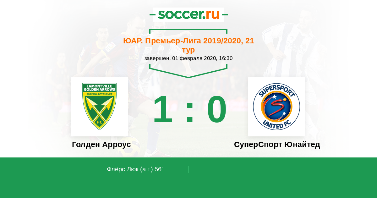 ЮАР. Премьер-Лига 10.02.2019 Голден Арроус Логотип футбольный клуб Голден Арроус (Дурбан) 2:3 Логотип футбольный клуб СуперСпорт Юнайтед (Претория) СуперСпорт Юнайтед