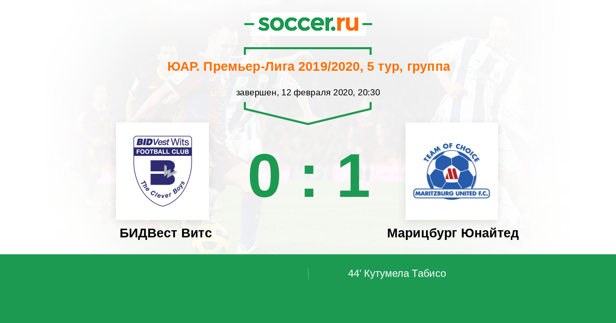 ЮАР. Премьер-Лига 15.02.2012 БИДВест Витс Логотип футбольный клуб БИДВест Витс (Йоханнесбург) 0:0 Логотип футбольный клуб Марицбург Юнайтед (Питермарицбург) Марицбург Юнайтед