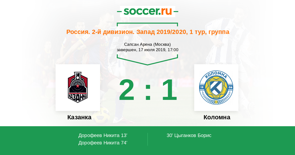 Россия. Вторая лига. Группа 2 09.08.2020 Казанка Логотип футбольный клуб Казанка (Москва) 2:1 Логотип футбольный клуб Коломна Коломна