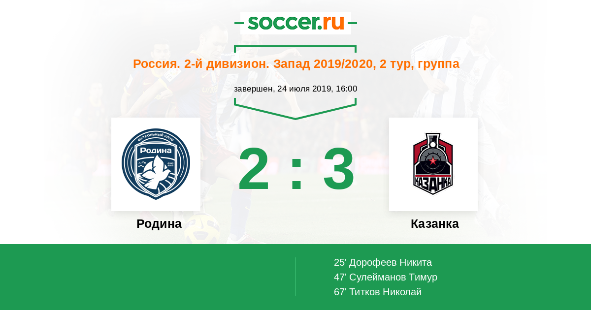 Россия. Вторая лига. Группа 2 18.10.2019 Казанка Логотип футбольный клуб Казанка (Москва) 5:1 Логотип футбольный клуб Родина (Москва) Родина