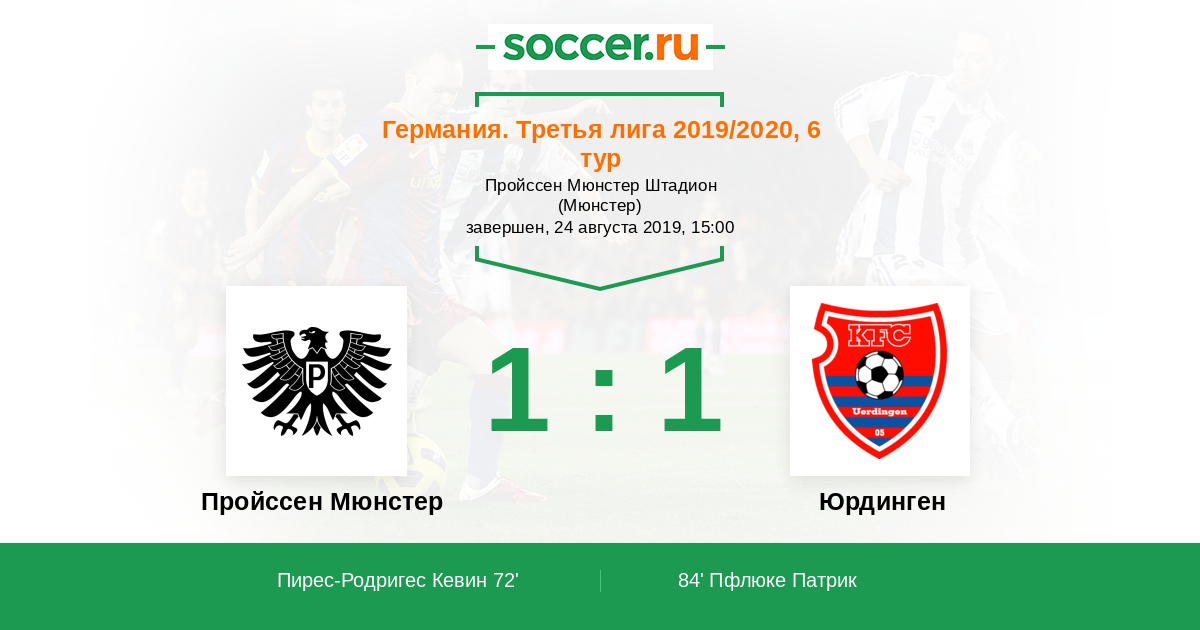 Германия. Третья лига 01.09.2018 Пройcсен Мюнстер Логотип футбольный клуб Пройcсен Мюнстер 0:1 Логотип футбольный клуб Юрдинген (Крефельд) Юрдинген