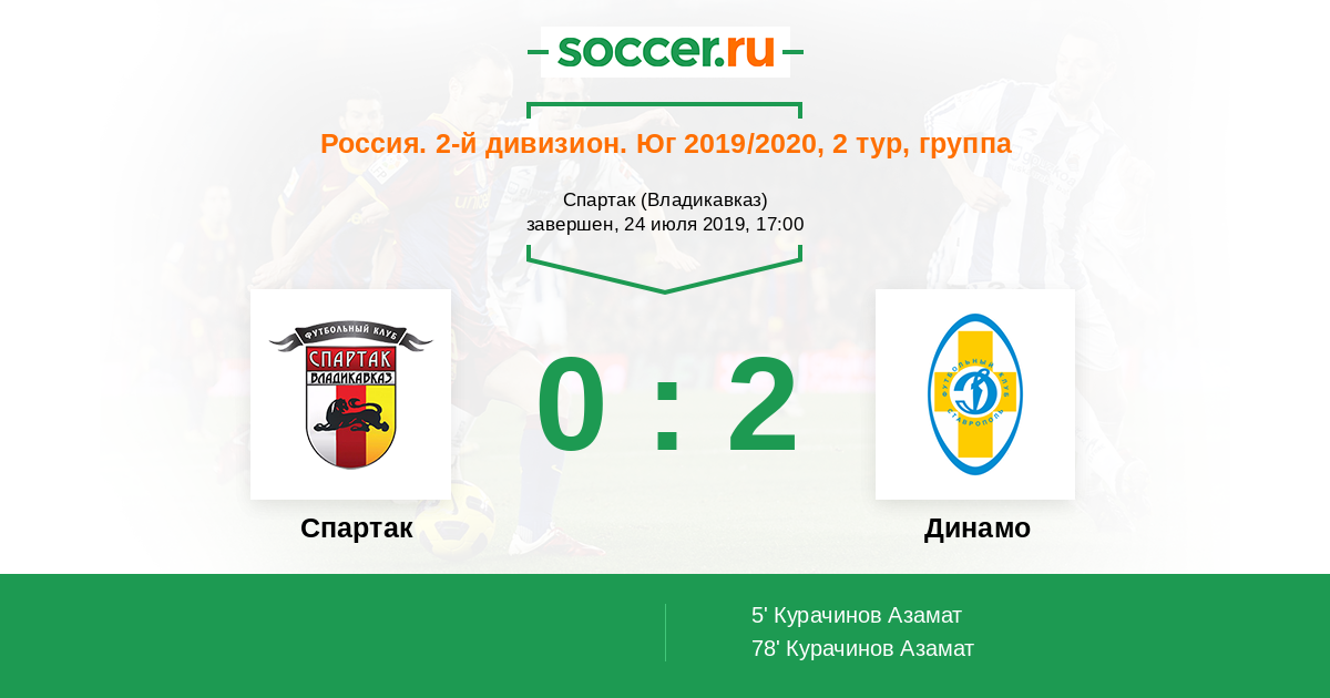 Россия. Вторая лига. Группа 1 09.09.2018 Спартак Логотип футбольный клуб Спартак (Владикавказ) 3:1 Логотип футбольный клуб Динамо Ставрополь Динамо Ставрополь