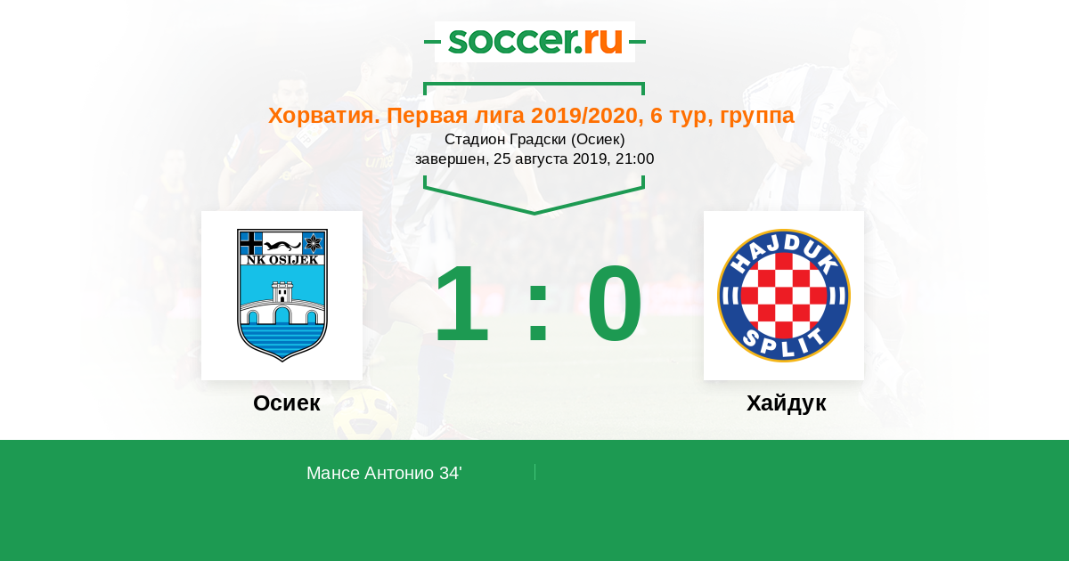 Хорватия. Первая лига 23.08.2020 Осиек Логотип футбольный клуб Осиек 1:2 Логотип футбольный клуб Хайдук (Сплит) Хайдук